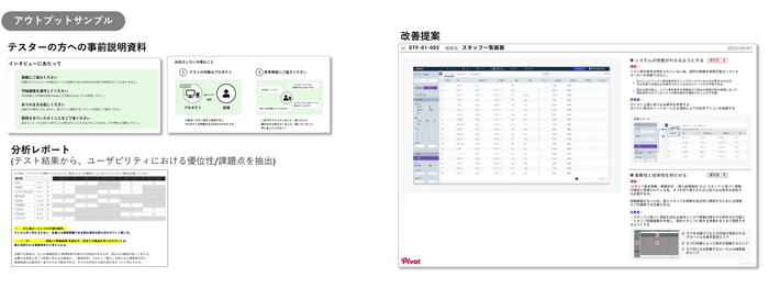 また、評価で特定された課題に対しては、具体的な改善策や対処法をレポートにまとめてご提供。プロダクトやサービスのユーザー体験(UX)向上を支援します。