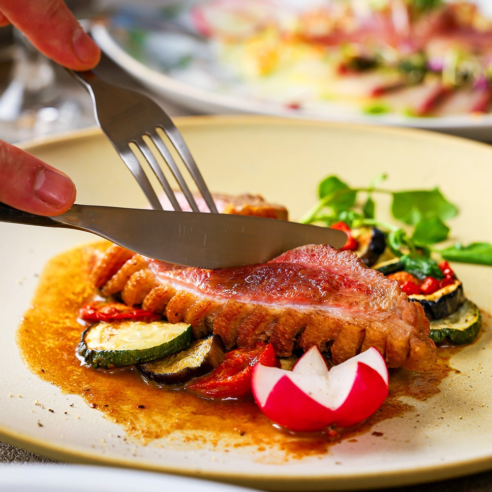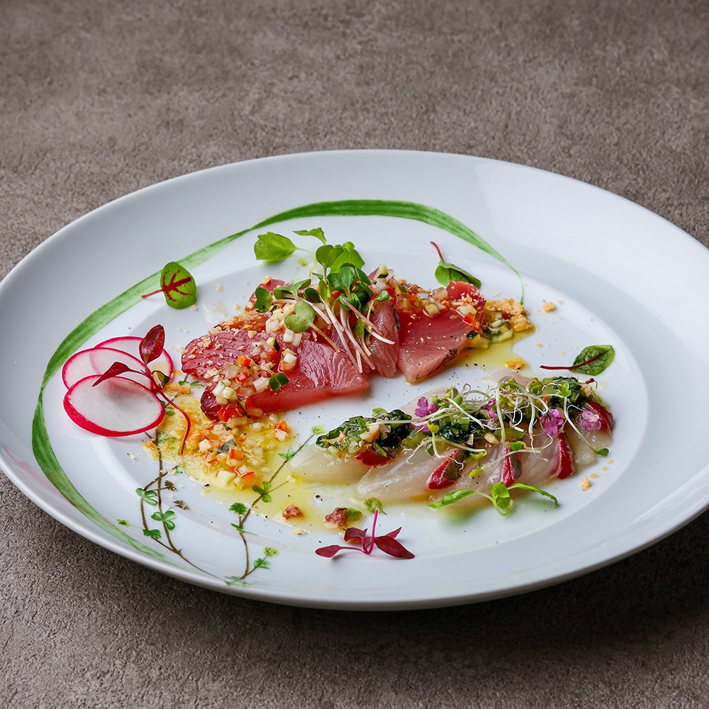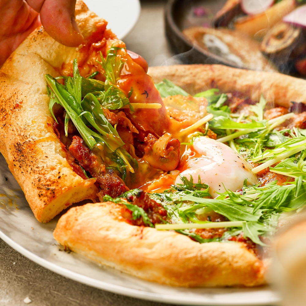 カウンターのタップでは、京都産麦芽を使い京都のブルワリーで醸造したIPA、ベルジャン・ホワイト、セッションペールエールのオリジナルクラフトビール(935円~)3種類を含む、ビール7種類をご用意。フードは、京鴨のラグーと京水菜をのせた「ビスマルクピザ」(1,595円)、京鴨ロース肉に鴨のだしとマルサラ酒で作るソースで仕上げた「京鴨ロースのグリル」(2,750円)など京食材を使ったもののほか、高知の漁港から直送した新鮮な魚の「鮮魚のカルパッチョ」(1,540円)などをラインナップ。「抹茶バスクチーズケーキ 枯山水」(1,320円)は、砂に見立てた粉砂糖をしいたプレートに、老舗茶屋「小原春香園」の抹茶を使用したバスクチーズケーキをのせたアート系スイーツです。