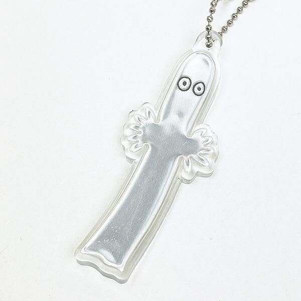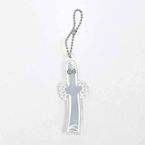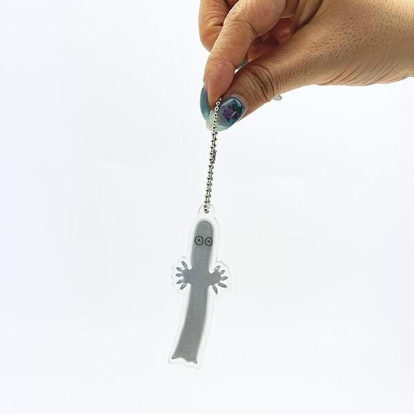 反射素材なのでライトにピカッと反射する、リフレクター機能付きのラバーキーホルダーです。ぷっくり厚みのあるフォルムがかわいく、ボールチェーン付きなのでバッグに付けやすいですよ。サイズ:8.1cm×3cm×0cm 素材:PVC