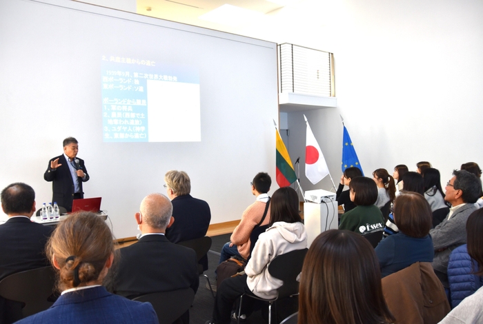 第二次大戦中、リトアニアの首都(当時)だったカウナスでユダヤ人難民に「命のビザ」を発給した人道外交官、杉原千畝(1900~1986)を研究する本学都市情報学部の稲葉千晴教授が12月2日、東京・代官山のヒルサイドテラスで開催されたリトアニア大使館主催のイベント「リトアニアのひととき」の「杉原千畝の日」のシンポジウムに登壇しました。
