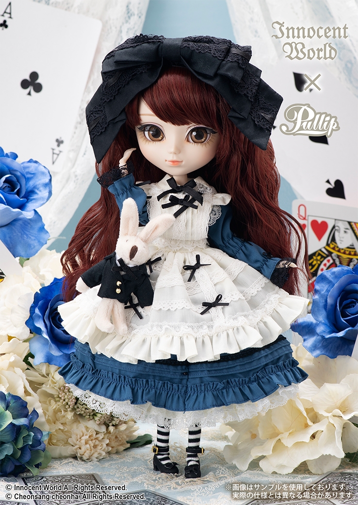 今回はブランドで大人気の「大人アリスシリーズ」のお洋服をドールサイズで再現!華やかなアリススタイルのドレスを着た、無邪気で可愛いプーリップが誕生しました。 目を惹く大きなリボンが可愛いヘッドドレスに、レースやフリルをふんだんにあしらったエプロン、深いブルーに黒のレースとリボンが上品なワンピースドレス、それぞれの衣装は可愛らしさの中に、少し大人びたクラシカルで上品な雰囲気が特徴です。 うさぎのぬいぐるみが可愛いドールサイズのポシェットを肩から下げれば、たちまちInnocent Worldらしい大人アリスの世界が広がります。
