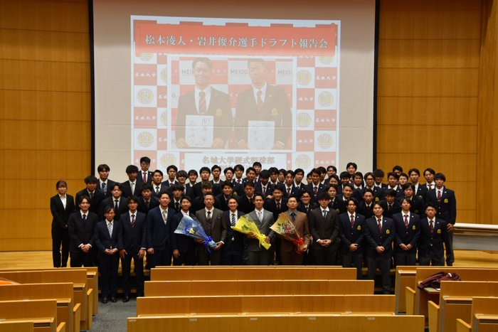 10月のプロ野球ドラフト会議で横浜DeNAベイスターズから2位指名された松本凌人投手と福岡ソフトバンクホークスから2位指名を受けた岩井俊介投手(ともに法学部4年)の報告会・壮行会が12月19日、硬式野球部が主催して天白キャンパスの名城ホールで開催されました。硬式野球部OBで広島東洋カープの栗林良吏投手(2018年度人間学部卒)も駆けつけ、プロ野球での活躍を期待して両投手に盛大なエールが送られました。