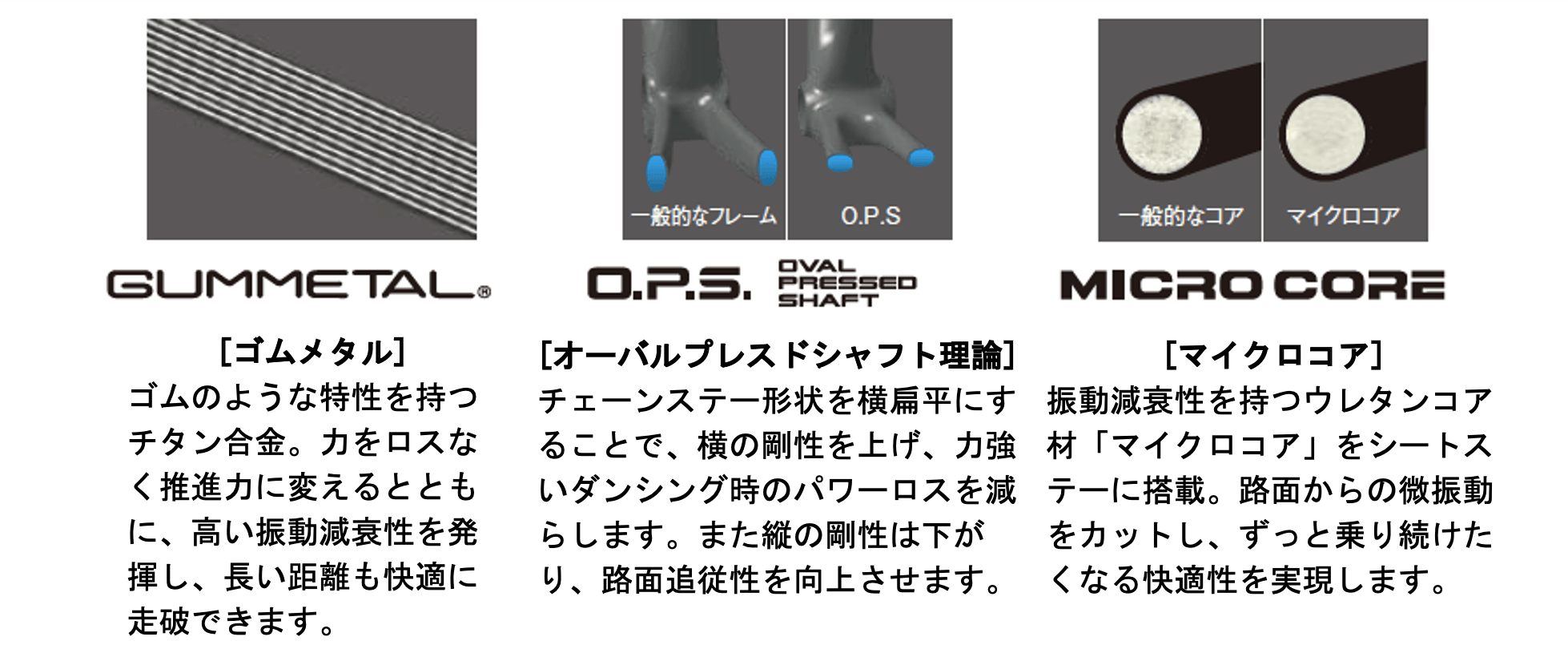 また、弊社ラケット独自の形状理論「オーバルプレスドシャフト理論」を用いて、剛性を保ちつつ振動に対して適度にしならせ路面追従性を高めています。シートステーには、振動減衰性を持つウレタンコア材「マイクロコア」を搭載。路面からの微振動をカットし、長距離でも心地よい走りを可能にします。