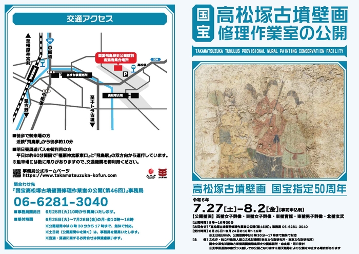 「国宝高松塚古墳壁画修理作業室の公開(第46回)」事務局にお電話いただくか、事務局ホームページにて、定員に達していない日時からご応募ください。