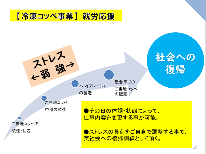 まず、当店の山口県産素材にこだわった「ご当地コッペ」を冷凍パンにして、その製造を障碍者支援施設「みんなの森」に委託し、社会復帰のお手伝いをする仕組みを10月より始めます。