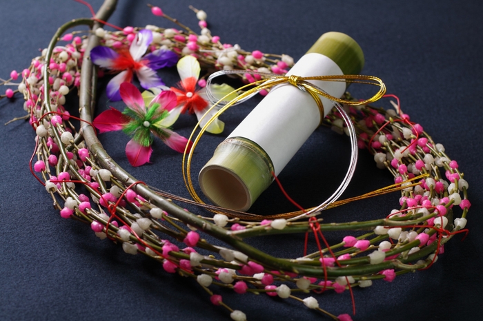 餅花飾りは、日本各地に伝わる縁起の良い飾り物です。由来や名称、飾り物の内容は地方によって違うようですが、江戸時代には盛んに飾られるようになり、正月や小正月(1月15日)の正月飾りのひとつとして、年神様に穀物のよき成長を祈願し、1年間を健康で幸福に過ごすために飾り、食していたといいます。