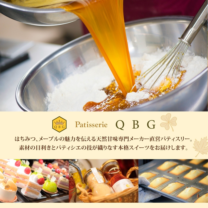 はちみつ・メープルシロップの魅力を伝える洋菓子店「パティスリーQBG」は、1931年創業の天然甘味料専門メーカー「クインビーガーデン」直営の洋菓子店。