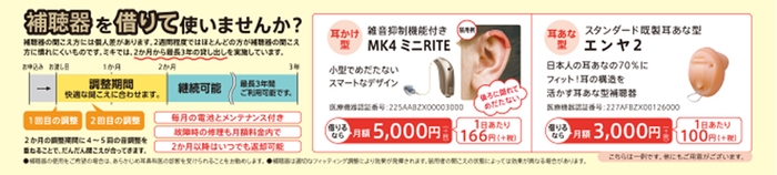 月額3,000円 +税~ の定額プランにて補聴器を貸し出しいたします。補聴器が使えるようになるか不安な方は、「借りる」ことから始めてみませんか?