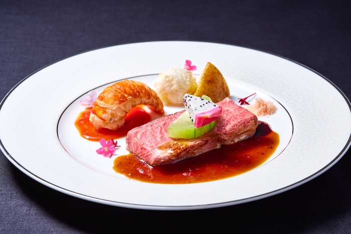 料理長厳選の沖縄県産の黒毛和牛とイセエビを250度の高温で一気に焼き上げ、仕上げのフランベで芳醇な香りを追加。うまみをぎゅっと閉じ込めた柔らかなステーキとプリプリのイセエビに県産のヘチマとドラゴンフルーツを添え、彩り豊かな一皿でご提供いたします。