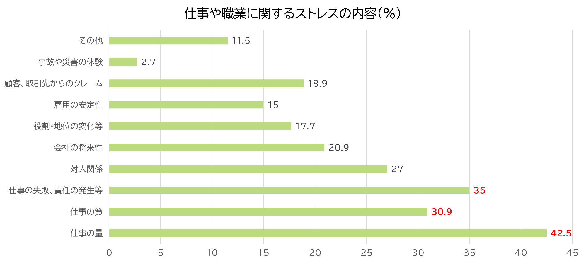 また、ストレスの内容(主な3つを回答)をみると、「仕事の量」が42.5%と最も多く、「仕事の失敗、責任の発生等」が35.0%、「仕事の質」が30.9%と続いており、多くの人が競争社会の中でストレスを抱えている実態が浮かび上がっています。