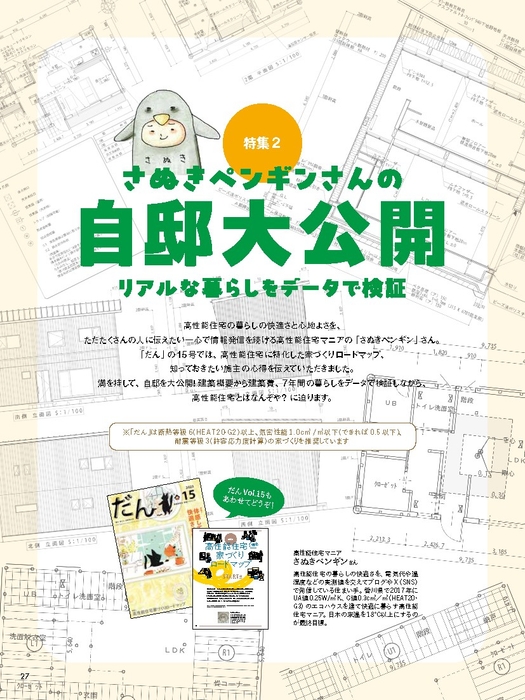 高性能住宅の暮らしの快適さと心地よさを、ただたくさんの人に伝えたい一心で情報発信を続ける高性能住宅マニアの「さぬきペンギン」さん。「だん」の15号では、高性能住宅に特化した家づくりロードマップ、知っておきたい施主の心得を伝えていただきました。