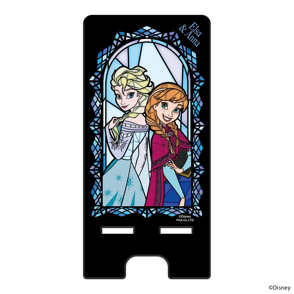 ディズニーキャラクターがステンドグラス調で色鮮やかにデザインされたスマートフォン スタンドです。コンパクトに収納できるパネル組み立て式です。スマートフォンの縦置き・横置き両対応で動画の視聴などにも最適。充電しながらも使用できます。