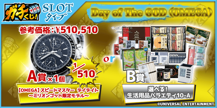 株式会社ピットアース(本社:東京都江東区有明、代表:野中誠之)のオンラインクジサービス『ガチくじ!』(https://gachi-kuji.jp/)では、年に一度の「ミリオンGODの日」、5月10日(月)20時より、A賞にあの人気パチスロ機ミリオンゴッドと、スイスを代表する高級腕時計メーカーOMEGA「スピードマスター」とのコラボレーション限定モデル『OMEGA スピードマスター デイデイト ミリオンゴッド限定モデル』(品番:3220.50)と、世界屈指の高級腕時計メーカーとして知られるブライトリングとのコラボレーション限定モデル『ブライトリング スーパーオーシャン クロノグラフ 42 ミリオンゴッド限定モデル』(型番:A108B93VRC)、また、B賞にセイコーの代表作の1つであるGPSソーラーウオッチ「アストロン」とのコラボレーション限定モデル『セイコーアストロン ミリオンゴッド限定モデル』(型番:SBXB055)が登場するクジを販売いたします!
