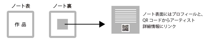 表面はアーティストの作品画像、裏面には QR コード (HACKK TAG アーティスト詳細情報にリンク)が掲載されており、ノー ト自体がアーティストの広報ツールとなります。