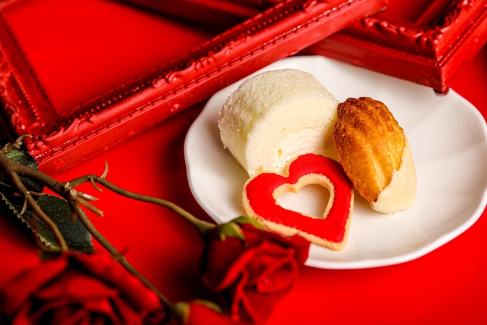 中段:ホワイトロールケーキ / プレーンマドレーヌホワイトチョコディップ/ ハートアイシングクッキー(推しカラー)