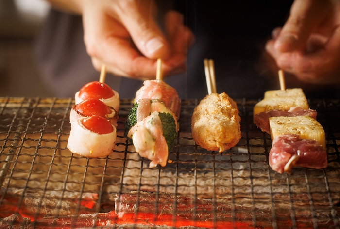 贅沢な備長炭の炭火焼きで、 安全安心な野菜と肉を串で楽しむ