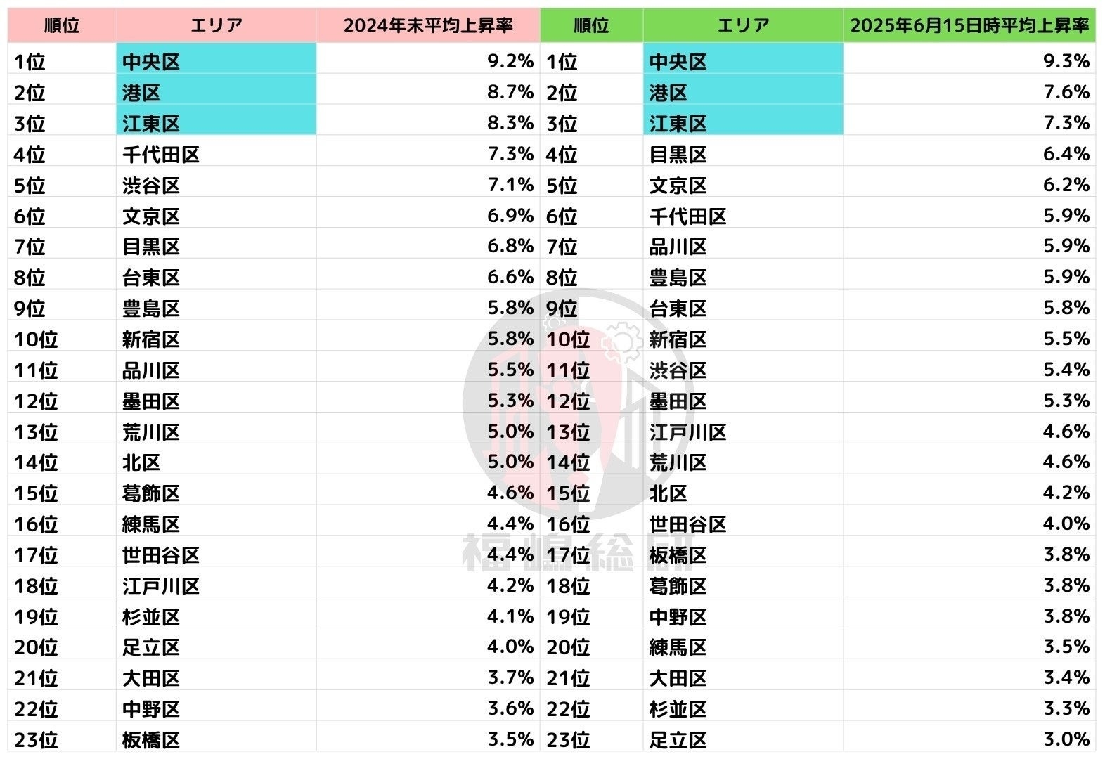 さらに、2024年と2025年前半を比較して特筆すべき動きとして、目黒区と品川区の存在が挙げられます。2024年には目黒区は価格上昇率で7位でしたが、2025年には4位にまで順位を上げています。また品川区も11位から7位へと、急速に順位を伸ばしています。