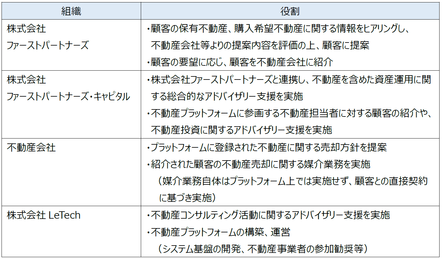 株式会社ファーストパートナーズ(本社:東京都港区)と株式会社ファーストパートナーズ・キャピタル、株式会社LeTech(本社:大阪市北区)が共同で開発を進めてきた、顧客本位での不動産取引を実現する「不動産プラットフォーム(以下、プラットフォーム)」について、トライアル検証を経て、本サービスとしてスタートしたことをお知らせします。
