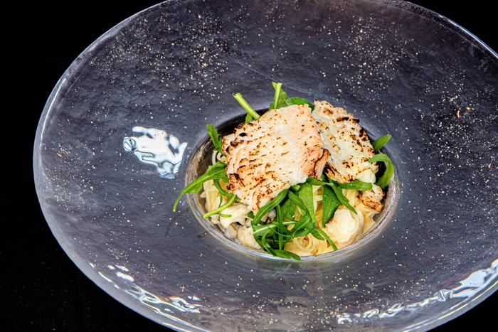 「のじまスコーラ」内にある「リストランテ・スコーラ」では、旬の鱧を使った「淡路島産鱧の冷製パスタ」をご提供いたします。鱧を湯引きした後に軽く炙ることで、豊かな風味とコクが増すように仕上げています。カッペリーニと組み合わせで、さっぱりとした口当たりとなり暑い夏に食べたくなる一品です。単品でのご注文のほかにもランチ・ディナーコースでの注文も可能です。