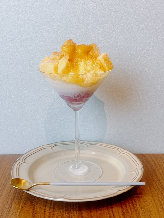 マンゴーのかき氷にシナモンとカルダモンのスパイスをミックスし、大人な味わいに仕上げました。フレッシュなマンゴーとカシスムースが彩る、トロピカルなパフェ氷です。
