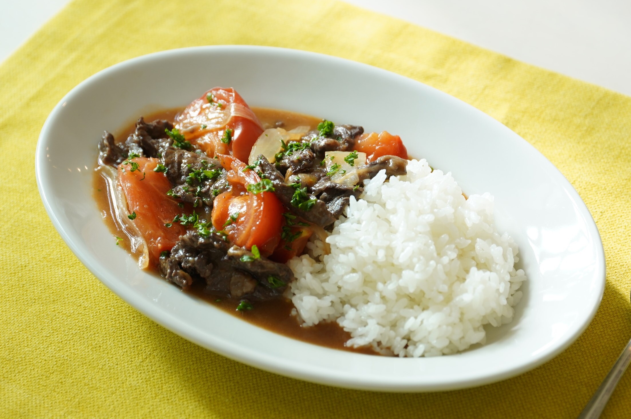 たっぷりのトマトとクジラ赤肉を使ったハッシュドビーフならぬ「ハッシュドクジラ」は、持久力UPに役立つ栄養素が豊富で、スタミナが必要なスポーツ選手におすすめの一品。