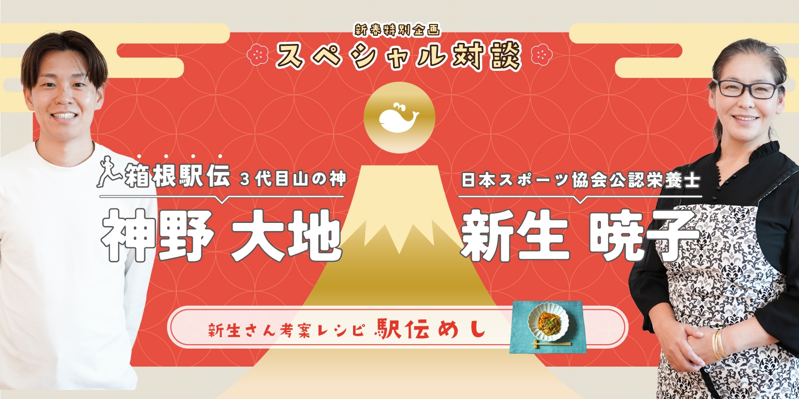 クジラに関する情報を発信する総合サイト「くじらタウン」では、青山学院大時代に箱根駅伝で活躍し、「三代目山の神」の愛称を持つプロマラソンランナーの神野 大地選手と、日本スポーツ協会公認スポーツ栄養士・新生 暁子さんとの対談を2024年1月1日(月)正午に公開します。また、その際に神野選手も召し上がった新生さん考案の「駅伝めし」レシピは1月2日(火)正午に公開することをお知らせします。