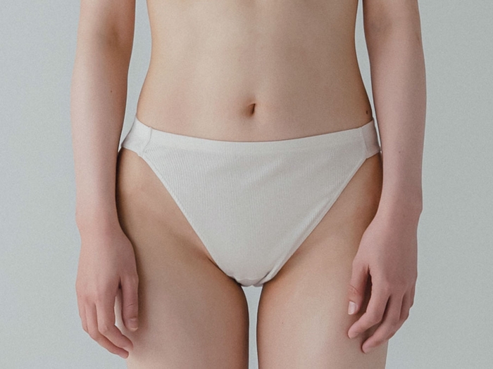 形状に関しては従来の“Flora Basic”同様に、脚ぐりをやや大きめにとる事で鼠径部の締め付けを最大限無くしています。その他、改善ポイントとしては股関節周りの仕様を、伸縮素材(マイクロテープ)から身生地を折り返す仕様に変更し、更に締め付けの緩和を行っています。肌当たりの気になるウエスト部分には、ソフトな伸縮のゴムを生地内部にくるんで内蔵し、お腹周りにやわらかくフィットする設計にしています。