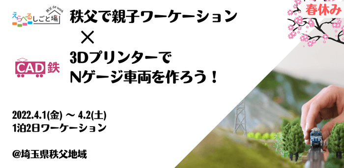 日本の新しい働き方を創造し、秩父エリアでワーケーション施設を展開するオフィスプラス株式会社(代表:出浦洋介 本社:埼玉県秩父市)は、3Dプリンターで鉄道模型を楽しむコミュニティ「CAD鉄」(主宰:斉藤正宏)と連携して、4月1日(金)、2日(土)にて【秩父で春休み親子ワーケーション】3DプリンターでオリジナルのNゲージ車両を作る親子ワークショップを開催します。