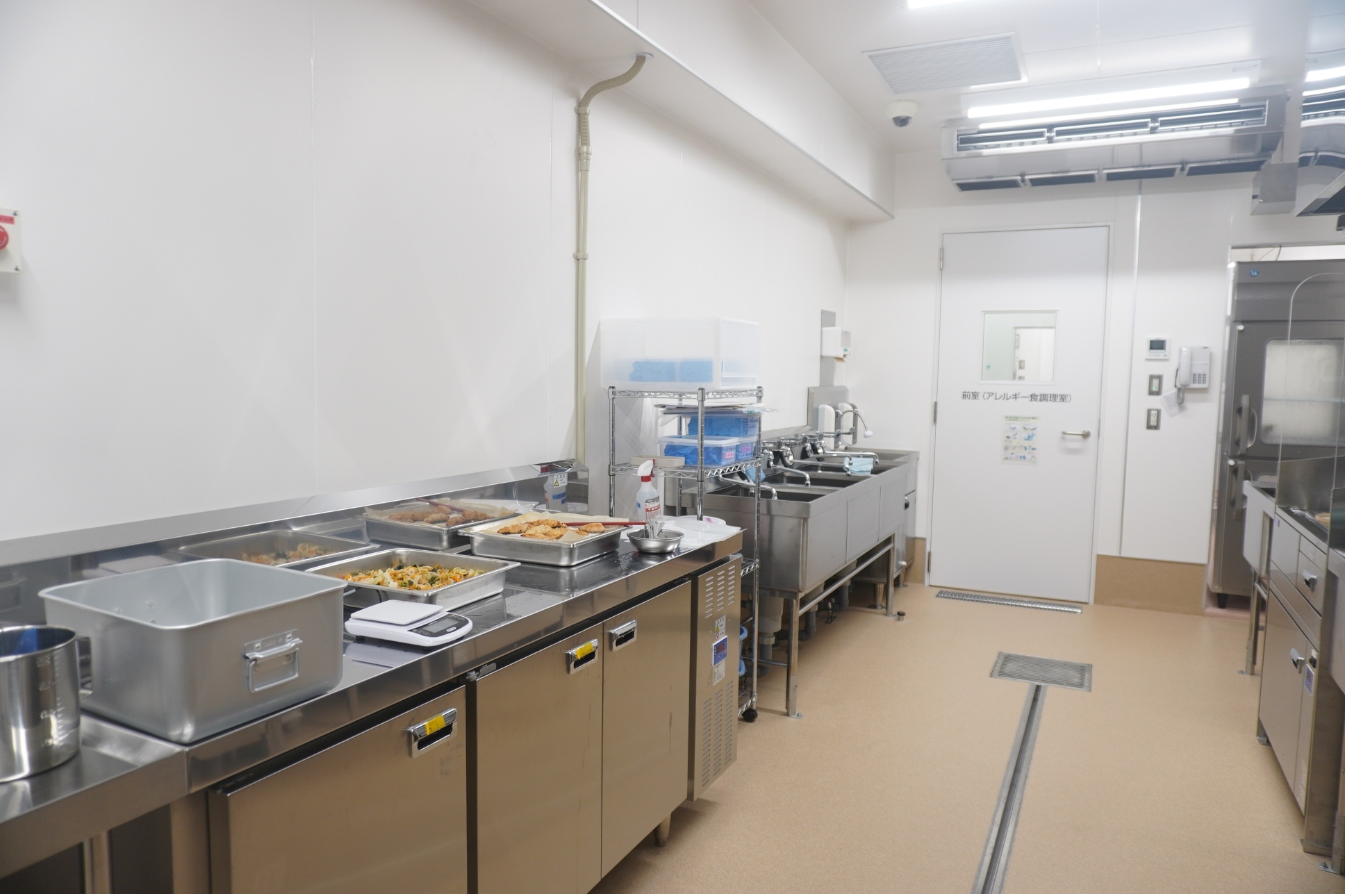 調理室は、HACCP(※2)の理念に基づき、徹底した衛生管理や作業工程管理に加え、ドライシステムの導入や「食物アレルギー等対応室」(食材の納入から調理、容器の洗浄まですべての作業で、通常食の作業と混線しない動線で行う調理室)といったハード面も整備し、「安心・安全」な食の提供を行います。