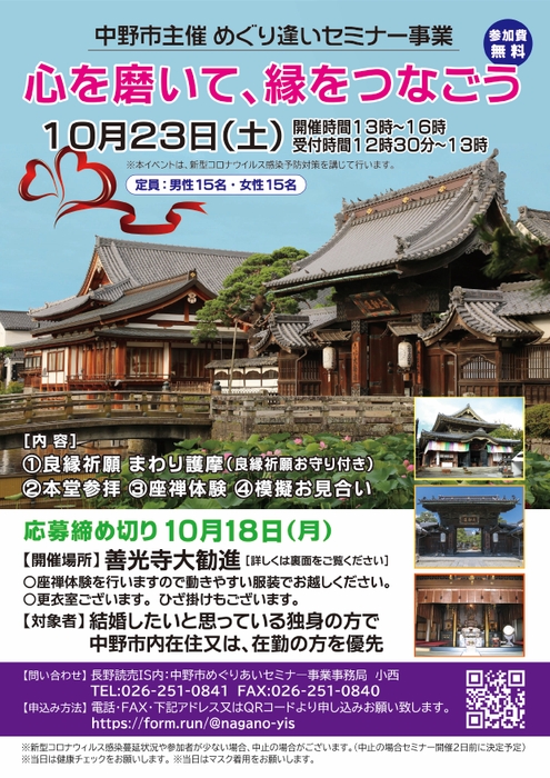 長野県中野市では婚活スキルアップセミナー「心を磨いて 縁をつなごう」を開催。現在、女性の参加者を募集しています。