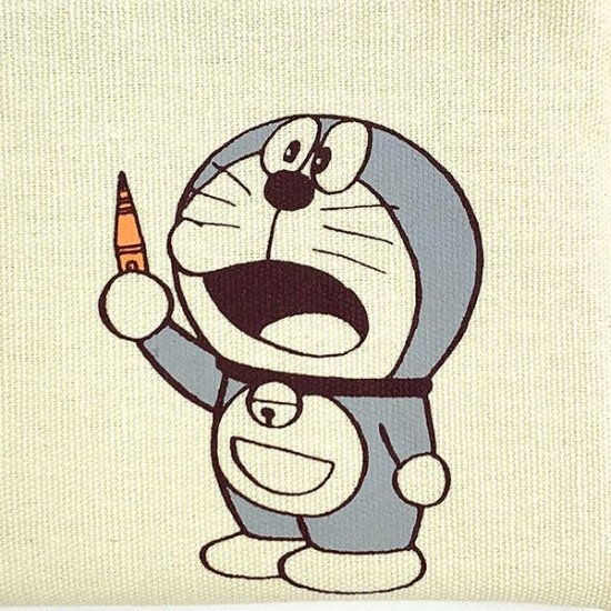 何か言いたげなドラえもん♪ちょっと気の抜けた雰囲気が可愛い♡普段の鮮やかなブルーではなく落ち着きのある色味が帆布によく馴染んでいますね。