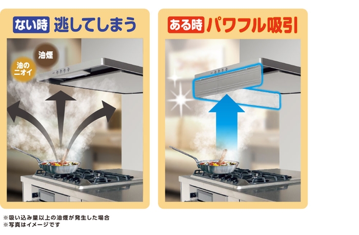 レンジフードに取付けることで、調理時に発生する 油煙や油のニオイの吸引量を高めるためのものです。