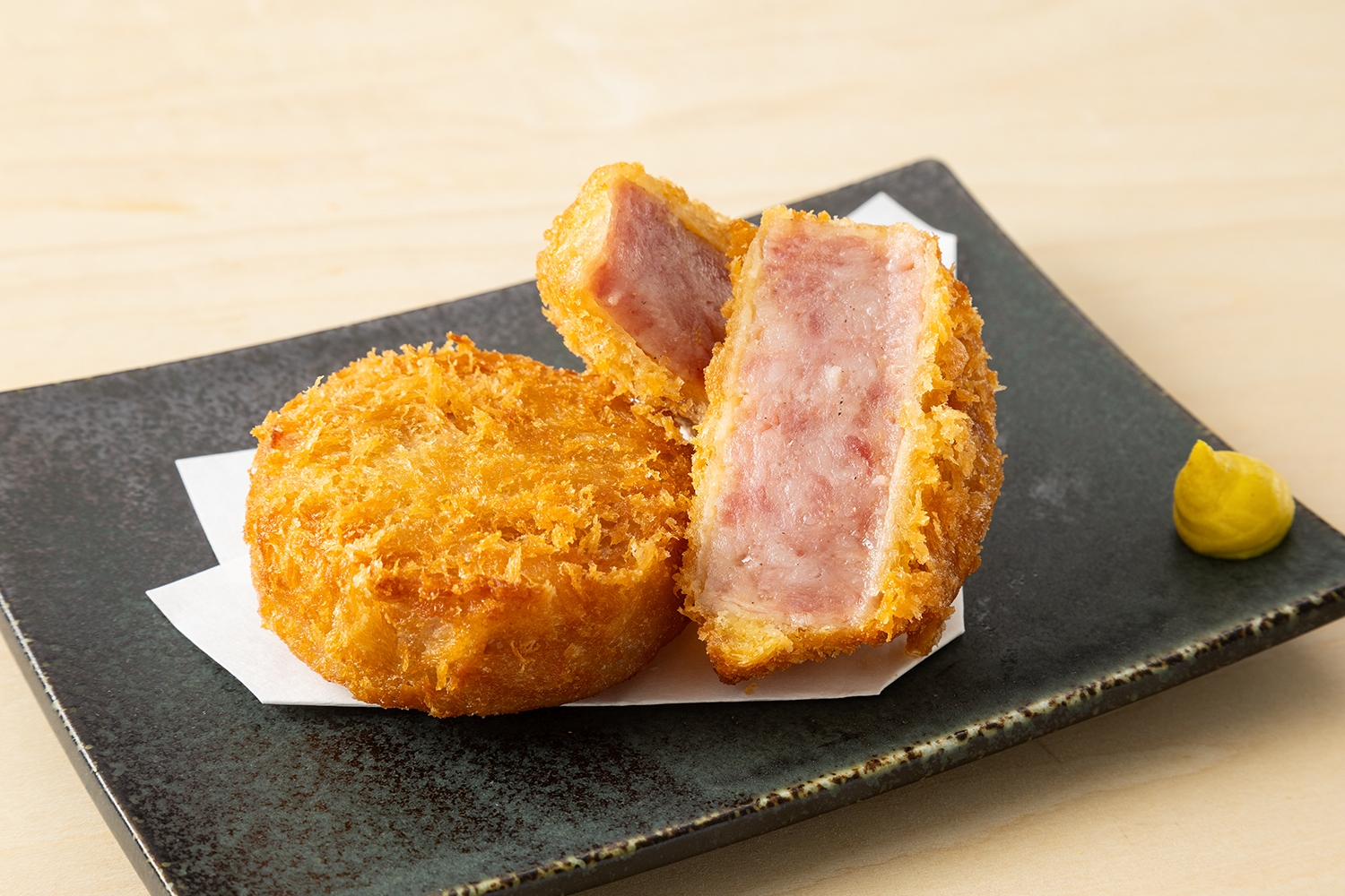 雲仙ハムを厚切りにし、外はカリッと中はジューシーに揚げました。