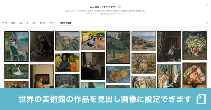 メディアプラットフォームnoteでは、世界の美術館が広く公開している作品画像を、noteの見出し画像に設定できるようになりました。ほかのクリエイターが提供した画像を記事の見出し画像にできる機能、「みんなのフォトギャラリー」から設定できます。