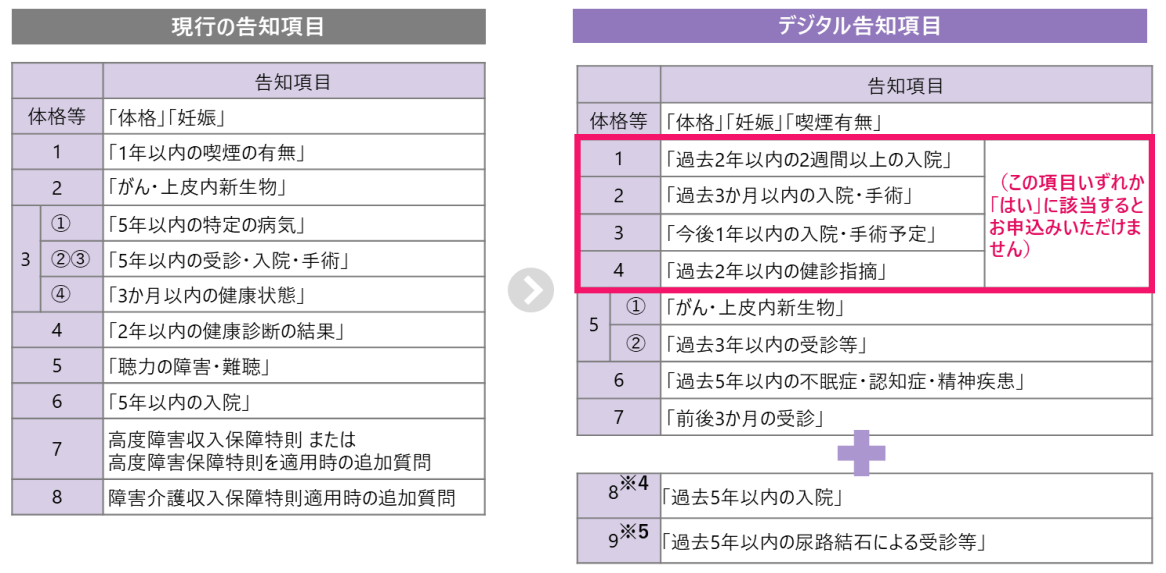 「デジタル告知」はシンプルかつ簡便な告知質問項目であり、告知漏れの防止や、スムーズな告知手続きにつながります。なお、「デジタル告知」と現行の告知(ペーパーレス告知・紙告知)では告知項目が異なるため、引受の結果が相違する場合があります。
