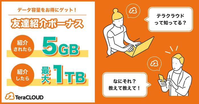 紹介者様には登録していただいたお友達の数だけ容量を追加!TeraCLOUDをお得に使えます。