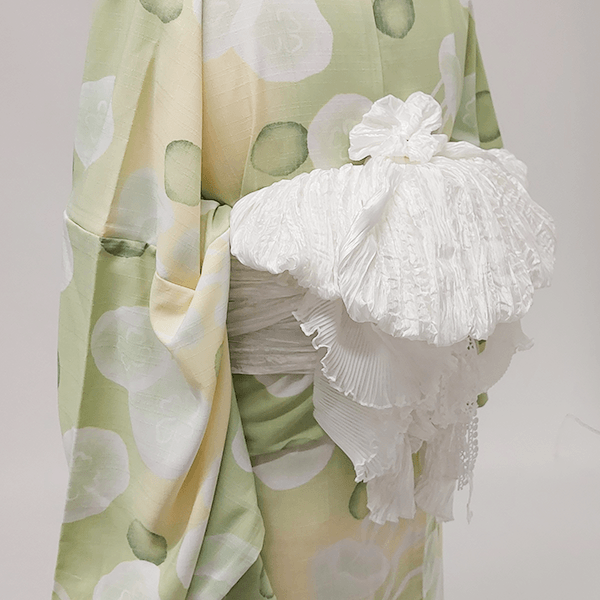 帯結びに使用している「しわ兵児帯」は京都きもの町オリジナルの浴衣帯です。しわ兵児帯は今年の浴衣のトレンドコーディネートでも大活躍のアイテムです。同じく京都きもの町オリジナル吸水速乾ポリエステル浴衣の2023年夏新作デザイン「くらげ」に合わせると、水族館にも出かけたくなるような素敵なイメージコーデが完成します。