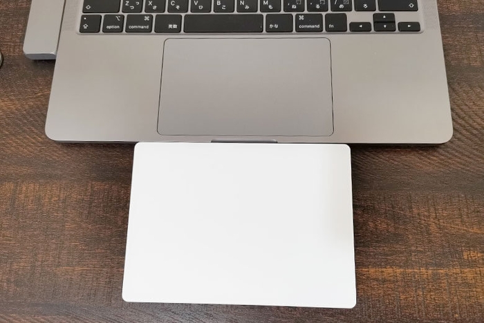 13インチMacbook Proのトラックパッドと並べると、縦も横も少しだけ大きいのが分かります。