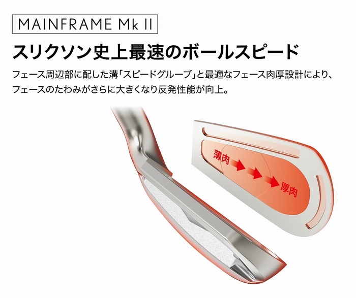 フェース周辺部に配した溝「スピードグルーブ」と最適なフェース肉厚設計により、フェースのたわみがさらに大きくなり反発性能が向上しました。