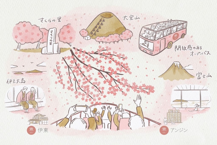 静岡県の伊豆半島に位置する温泉旅館、「界 アンジン」、「界 伊東」は、2022年3月20日~4月10日の期間、伊豆のお花見めぐり「桜オープンバスツアー」を実施します。オープンエアのバスを使ったツアー「スカイバス東京」を展開する、日の丸自動車興業株式会社(所在地:東京都文京区 代表取締役副社長:富田哲史)と、運行会社の株式会社東海バス(所在地:静岡県伊東市 代表取締役社長:眞野大輔)と界が提携し、運行します。日本の春の訪れを晴れやかに彩る「桜」が満開を迎えるシーズンに、伊豆の桜の名所として名高い「さくらの里」や、地元スタッフおすすめの「梅ノ木平桜スポット」へ開放感あふれるオープンエアのバスで繰り出し、美しいソメイヨシノの景色の中を駆け抜けます。「界 アンジン」、「界 伊東」にお泊りのゲストに無料(先着受付)で提供します。