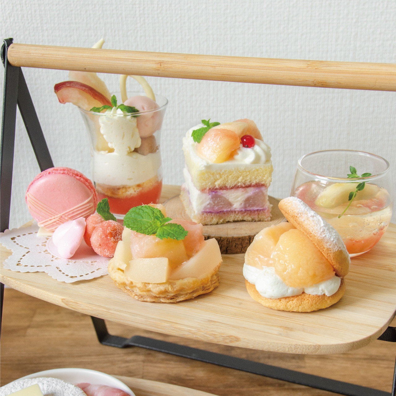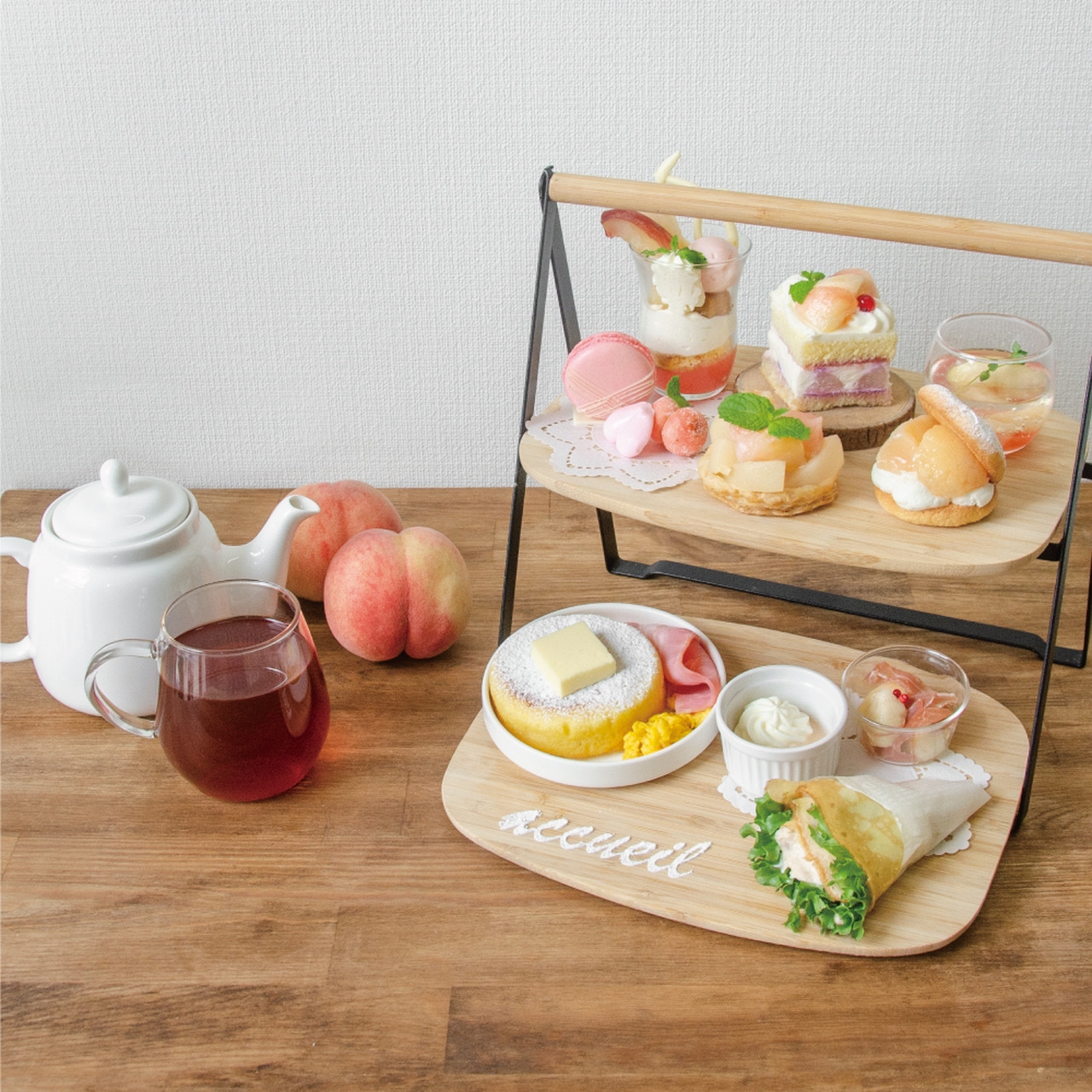 様々な形で桃を楽しんでいただけるように桃のショートケーキや桃のパフェなどのスイーツに加え、アクイーユ初となるツナマヨクレープやミニパンケーキ(スクランブルエッグ&ベーコン)などのセイボリーで、存分に桃を味わえる彩り豊かな12品のアフタヌーンティーです。