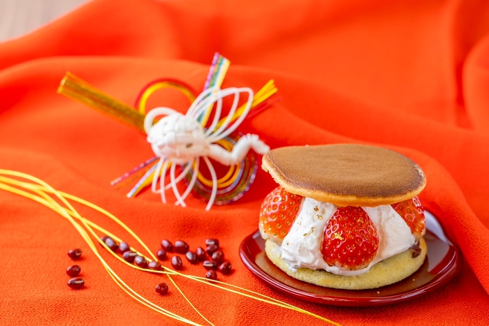 又一庵の粒あんとバター、たっぷりのホイップクリームにいちごと金箔をのせて。甘酸っぱくて、とろける味わいです。いちごとホイップクリームの紅白の彩りと金箔でお正月らしく華やかな仕上がりです。