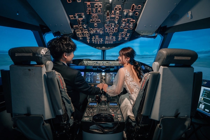 フライトシミュレーター:本物さながらの臨場感あふれるコックピットで叶える、特別な時間。精巧な操縦席で見つめ合う姿を写した一枚は、ドラマチックな仕上がりに。