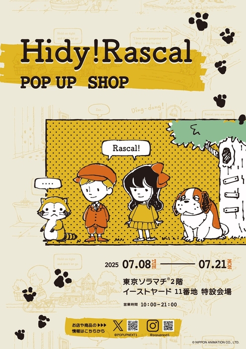 2025年7月8日(火)より、初の期間限定店舗として「Hidy!Rascal POP UP SHOP」を東京ソラマチ内で開催いたします。同店で販売する新商品として、ステーショナリーやアパレルなど新たに約30アイテムを展開。また、ノベルティとしてオリジナルコースターをご用意している他、7月8日(火)からはオリジナルクリアボトル、7月15日(火)からはオリジナルサコッシュを、条件を満たされた方にそれぞれ先着でプレゼントいたします。この機会にぜひ足をお運びください。