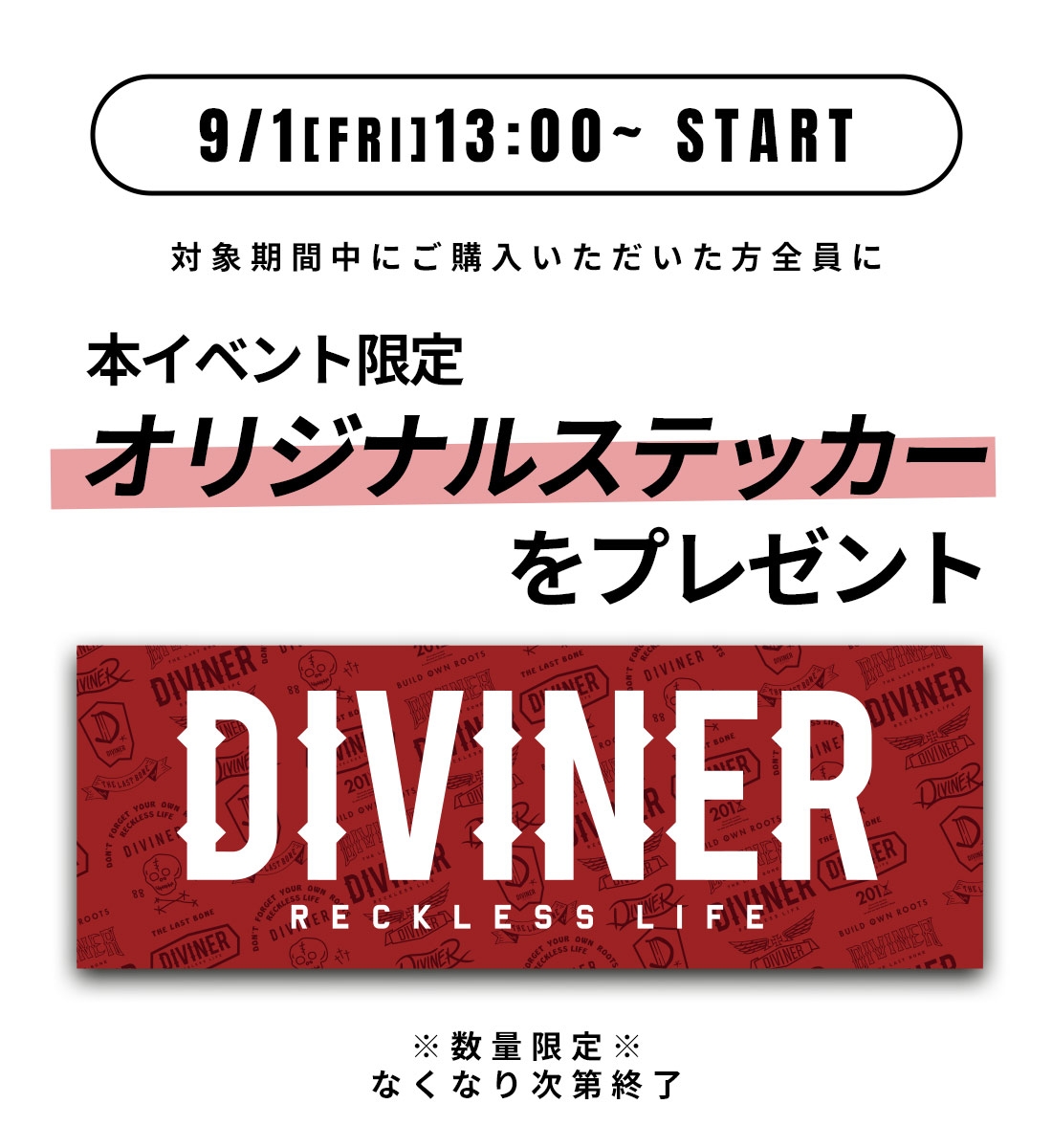 2023年9月1日(金)13時からDIVINERでお買い物いただいた方全員に【本イベント限定 オリジナルステッカー】をプレゼント。