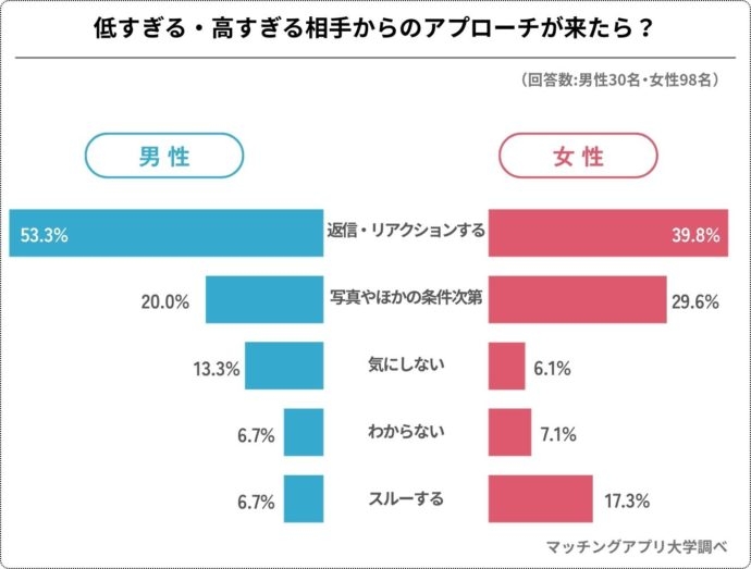 「いいね」やアプローチがあれば、とりあえずリアクションや話をしてみるという人が男女とも多くいました。