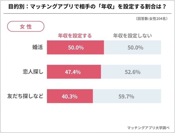 女性も同じく、マッチングアプリの利用目的が婚活の場合は半数の人が「年収を設定する」と回答しました。恋人探しが目的の人は47.4%、友だち探しでは40.3%が「年収」を設定しているようです。