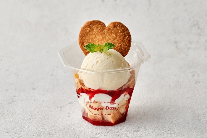 イートイン向け商品。軽く温めた「てのひら乃が美(レモン)」の上に、ハーゲンダッツのクリーミーでコクのあるバニラアイスクリームを乗せ、ホイップとストロベリーソースで飾ったアイスクリームプレートです。レモンピールのアクセントが効いて、濃厚な中にも爽やかさを感じられる一品となっております。