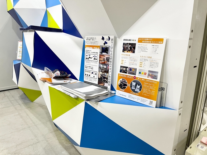アルプススチール株式会社 様はSDGsのパッケージデザインが入ったスチールロッカーを展示、同じブースにて弊社はSDGsというテーマに合わせ折り目をベースに色をデザインした壁面を展示いたしました。