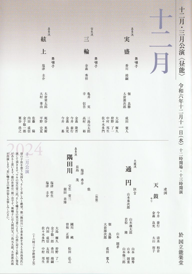 東京能楽囃子科協議会主催、『東京能楽囃子科協議会12月定式能』が2024年12月11日 (水)に国立能楽堂(東京都 渋谷区 千駄ヶ谷 4-18-1)にて上演されます。
